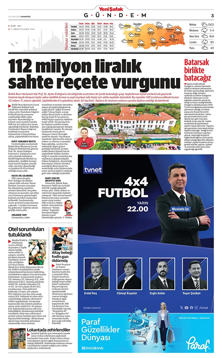 Balıklı Rum Hastanesi’nde Prof. Dr. Ayten Erdoğan’ın öncülüğünde eczacıların da içinde bulunduğu grup, başkalarının kişisel verilerini ele geçirerek hastane kaydı olmayan kişiler adına özellikle kırmızı ve yeşil reçeteye tabi ilaçlar için sahte reçeteler düzenledi. Bu reçeteler SGK’ya fatura edilerek kurum 112 milyon TL zarara uğratıldı. Şüphelilerden 6’sı gözaltına alındı, bir kişi firari. İlaçların bir kısmının yabancı uyruklu kişilere satıldığı da belirlendi.