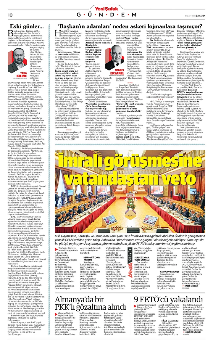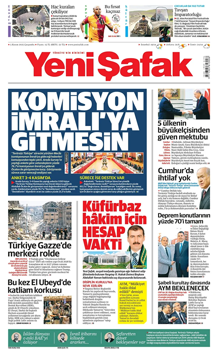 Yeni Şafak Gazetesi’nin 05 Kasım 2025 tarihli birinci sayfasında yer alan manşet ve haberler…