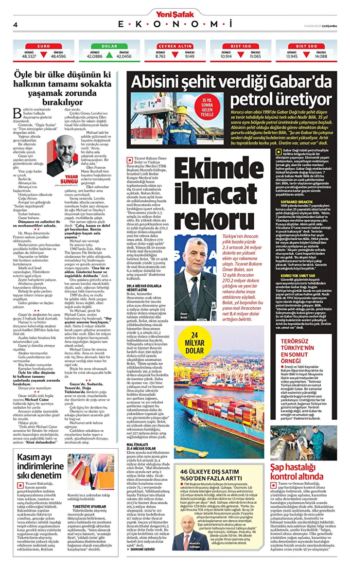 Yeni Şafak Gazetesi’nin 05 Kasım 2025 tarihli birinci sayfasında yer alan manşet ve haberler… Ekimde ihracat rekoru Türkiye’nin ihracatı yıllık bazda yüzde 2,3 artarak 24 milyar dolarla en yüksek ekim ayı rakamına ulaştı. Ticaret Bakanı Ömer Bolat …