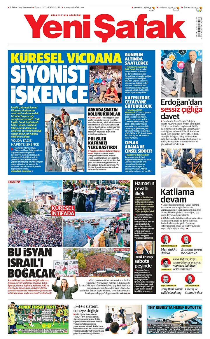 Yeni Şafak Gazetesi’nin 06 Ekim 2025 tarihli birinci sayfasında yer alan manşet ve haberler…