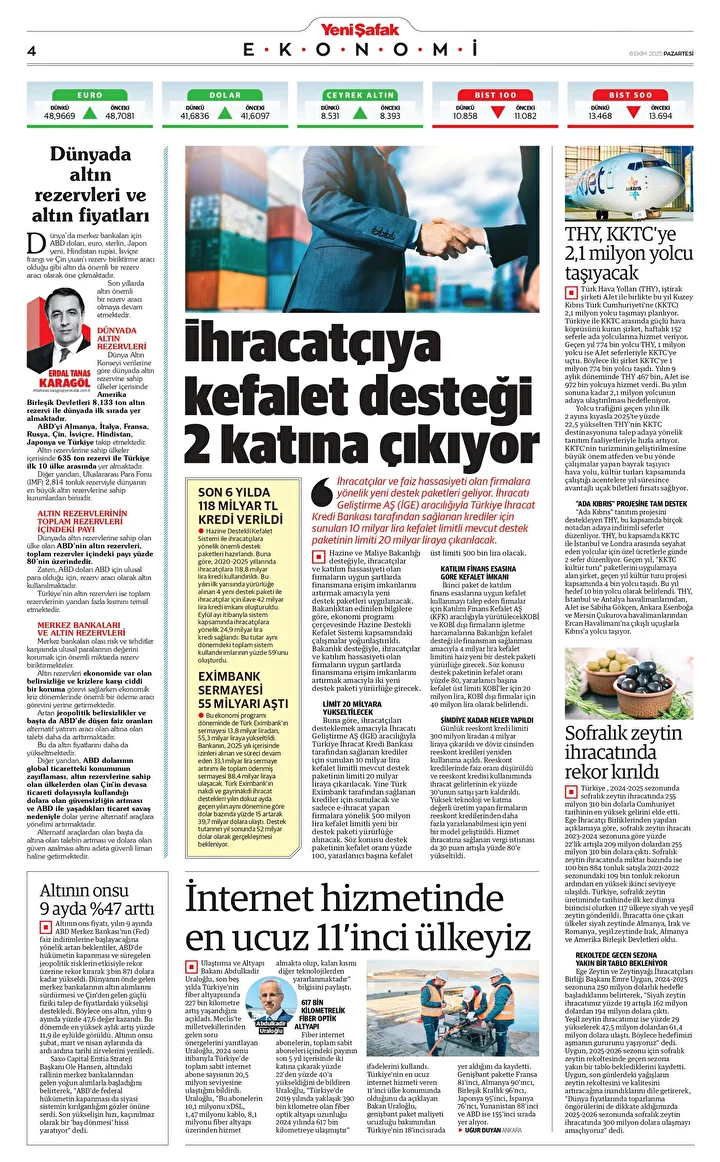 Yeni Şafak Gazetesi’nin 06 Ekim 2025 tarihli birinci sayfasında yer alan manşet ve haberler… İhracatçıya kefalet desteği 2 katına çıkıyor İhracatçılar ve faiz hassasiyeti olan firmalara yönelik yeni destek paketleri geliyor. İhracatı Geliştirme AŞ …