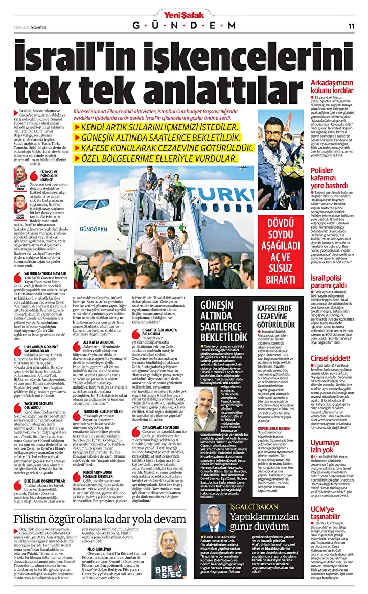 İsrail’in, Küresel Sumud Filosu’na uluslararası sulardaki saldırısına dair, İstanbul Başsavcılığı soruşturma başlattı. Türk, İngiliz, Suudi Arabistanlı, Faslı, Tunuslu, Ürdünlü 59 kişi, terör devletinin alıkoyma sürecinde işlediği sistematik insan hakları ihlallerini anlattı.