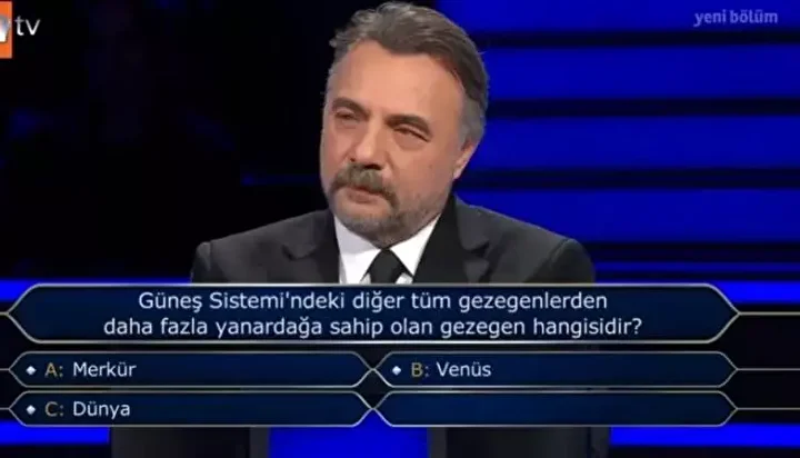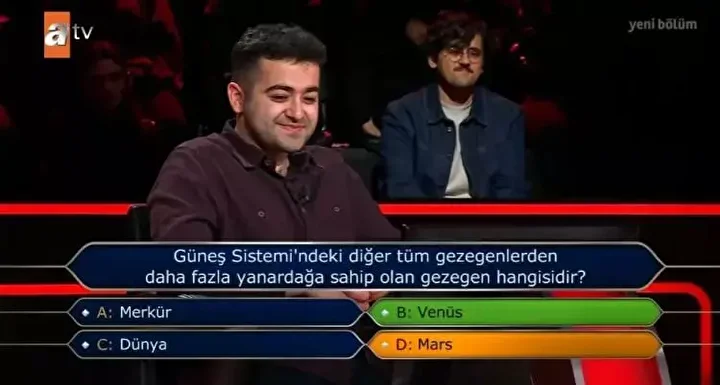 Yarışmacı Mehmet Sakin “Güneş Sistemi’ndeki diğer tüm gezegenlerden daha fazla yanardağa sahip olan gezegen hangisidir?” sorusuna yanlış cevap verince yarışmadan elendi.