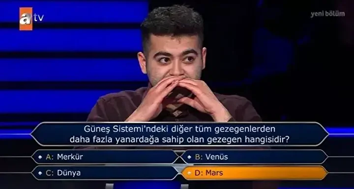 Sakin, yarışmadan çekilmek yerine risk alarak soruyu “D şıkkı Mars” yanıtını vermeyi tercih etti.