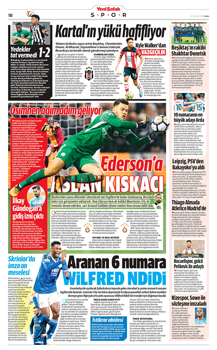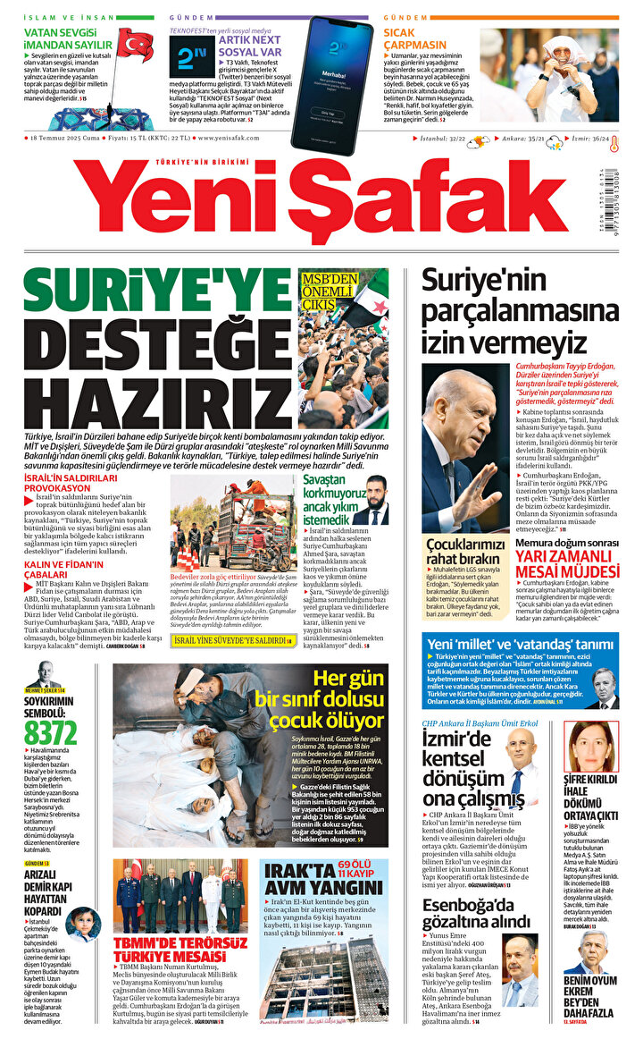 Yeni Şafak Gazetesi’nin 18 Temmuz 2025 tarihli birinci sayfasında yer alan manşet ve haberler…