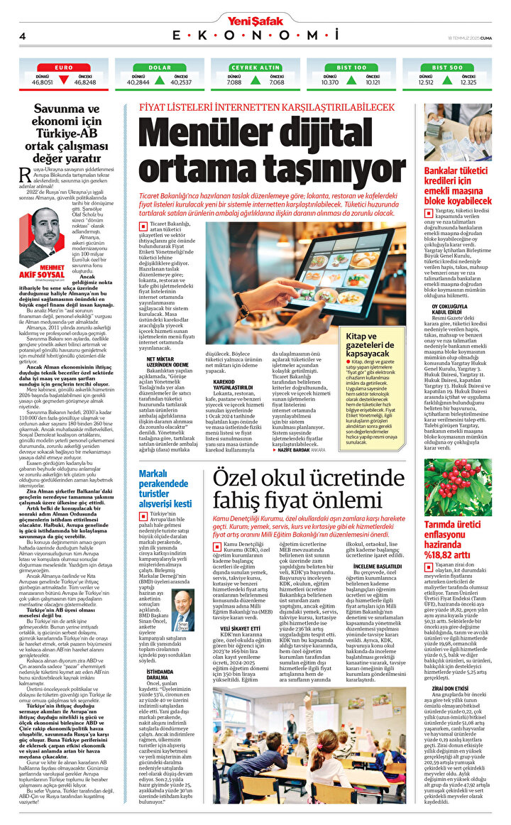 Yeni Şafak Gazetesi’nin 18 Temmuz 2025 tarihli birinci sayfasında yer alan manşet ve haberler… Menüler dijital ortama taşınıyor: Fiyat listeleri internetten karşılaştırılabilecek Ticaret Bakanlığı’nca hazırlanan taslak düzenlemeye göre; lokanta …