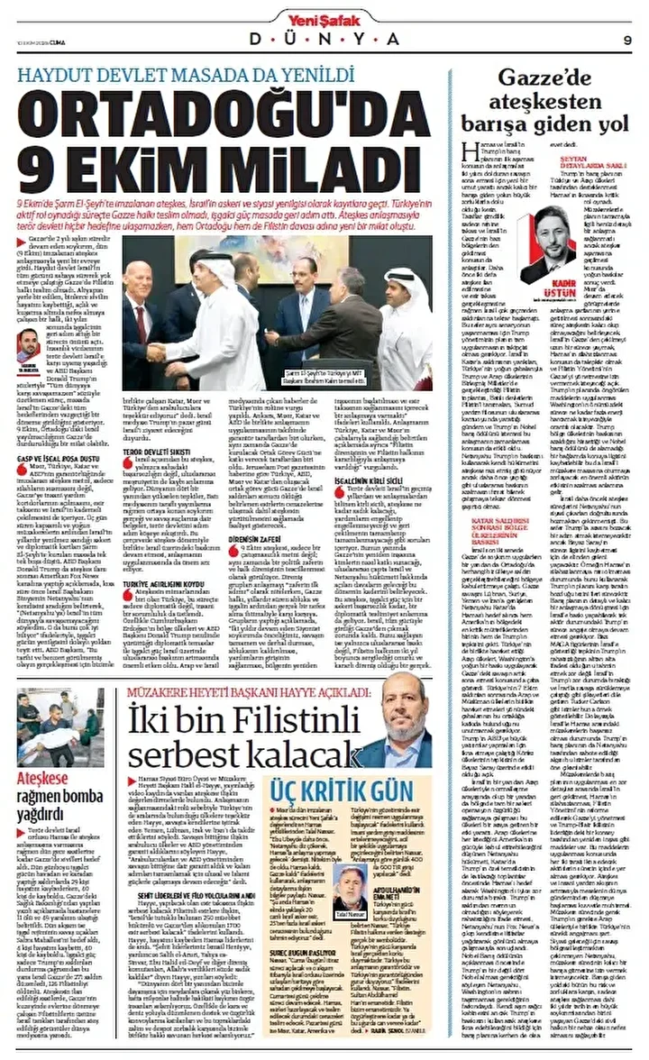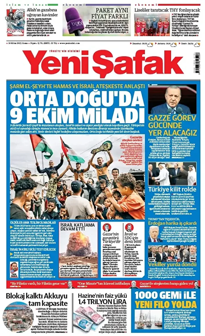 Yeni Şafak Gazetesi’nin 10 Ekim 2025 tarihli birinci sayfasında yer alan manşet ve haberler…