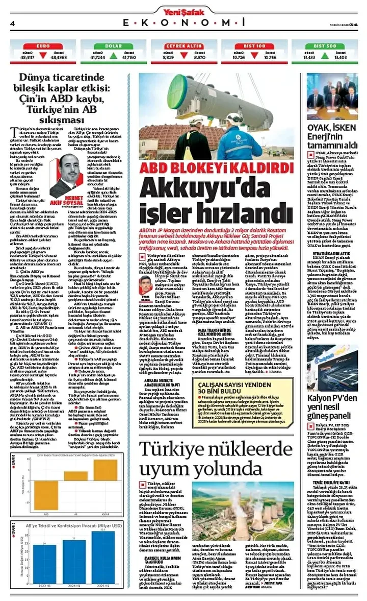 Yeni Şafak Gazetesi’nin 10 Ekim 2025 tarihli birinci sayfasında yer alan manşet ve haberler… Akkuyu’da işler hızlandı ABD’nin JP Morgan üzerinden dondurduğu 2 milyar dolarlık Rosatom fonunun serbest bırakılmasıyla Akkuyu Nükleer Güç Santrali …