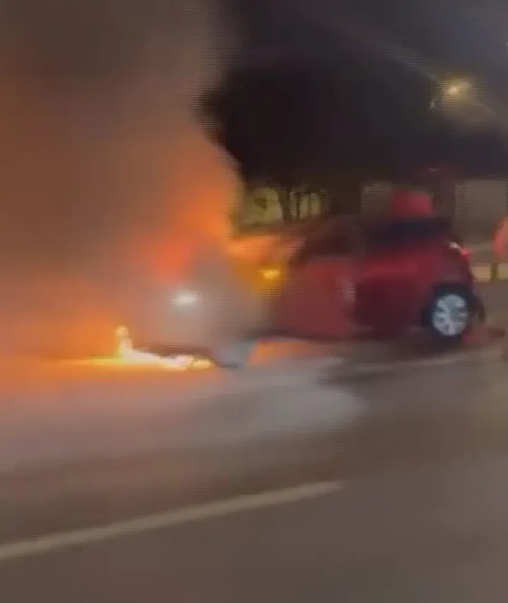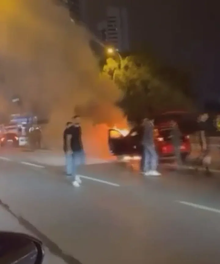 Yangın, itfaiye ekipleri tarafından söndürülürken, otomobil demir yığınına döndü. O anlar diğer sürücülerin cep telefonu ile kaydedildi.