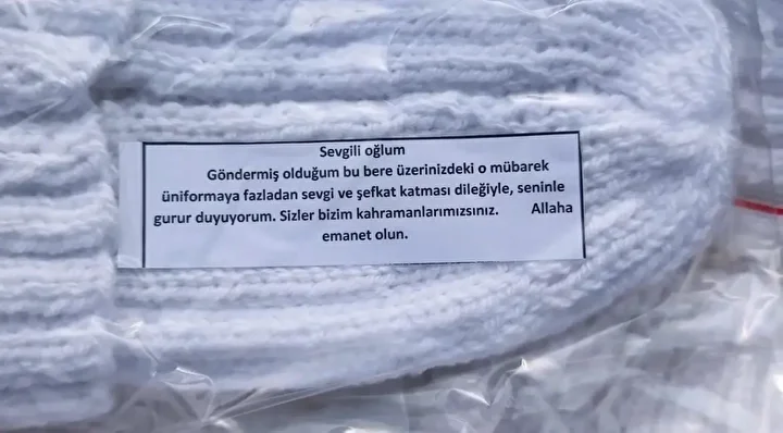 Sabahat teyze berelerin içine bıraktığı notta,“Sevgili oğlum, göndermiş olduğum bu bere üzerinizdeki o mübarek üniformaya fazladan sevgi ve şefkat katması dileğiyle, seninle gurur duyuyorum. Sizler bizim kahramanlarımızsınız. Allah’a emanet olun.” ifadeleri yer aldı.