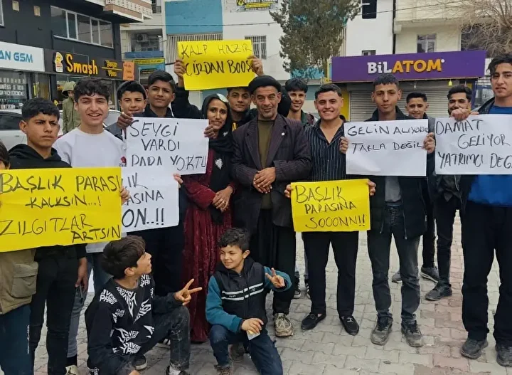Şanlıurfa’da gelenekselleşen ancak son yıllarda fahiş rakamlar nedeniyle toplumsal bir krize dönüşen “başlık parası”, Akçakaleli gençleri sokağa döktü. Ellerinde “Kalp hazır cüzdan boş”, “Damat geliyor, yatırımcı değil”, “Başlık parası kalksın …