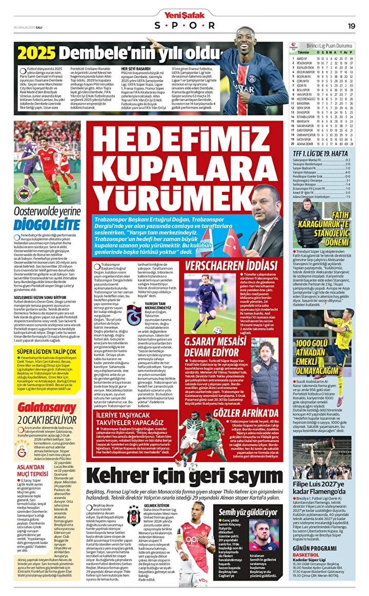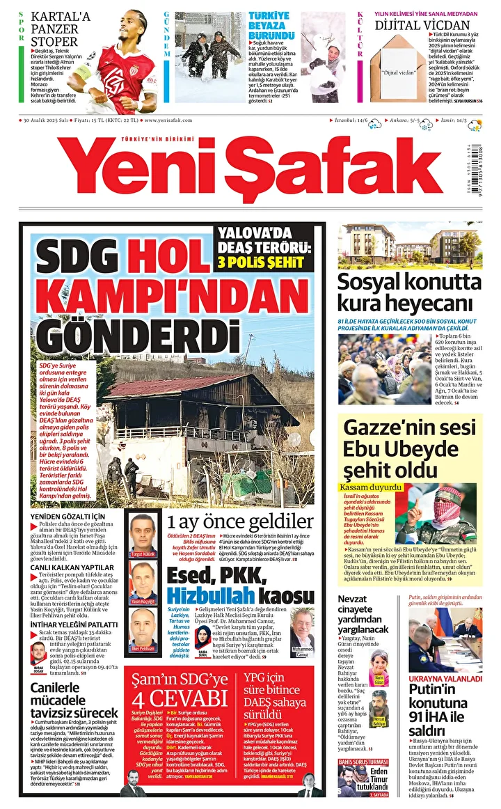 Yeni Şafak Gazetesi’nin 30 Aralık 2025 tarihli birinci sayfasında yer alan manşet ve haberler…