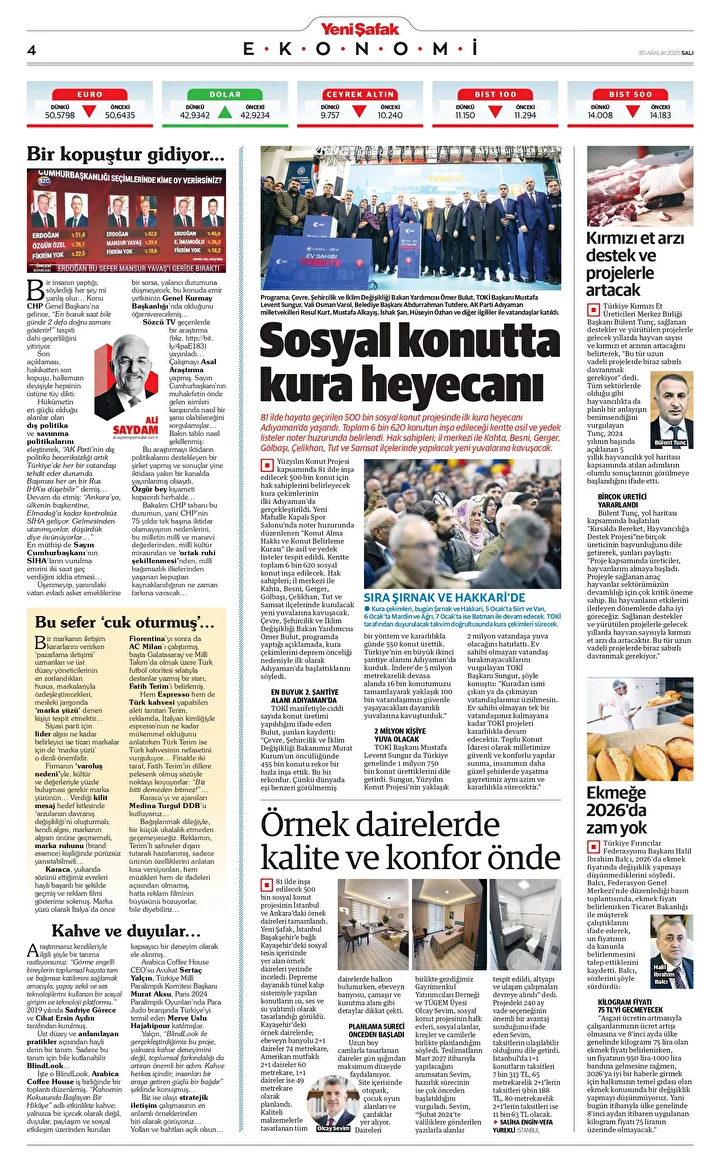 Yeni Şafak Gazetesi’nin 30 Aralık 2025 tarihli birinci sayfasında yer alan manşet ve haberler… Sosyal konutta kura heyecanı 81 ilde hayata geçirilen 500 bin sosyal konut projesinde ilk kura heyecanı Adıyaman’da yaşandı. Toplam 6 bin 620 konutun …