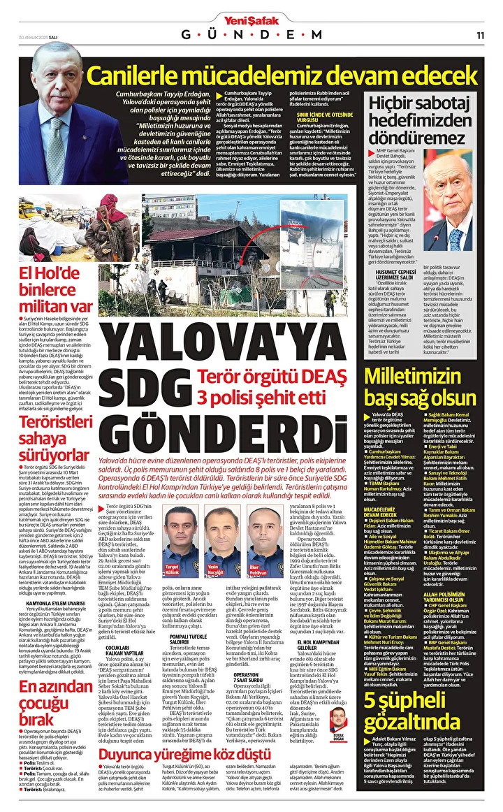 Yalova’da hücre evine düzenlenen operasyonda DEAŞ’lı teröristler, polis ekiplerine saldırdı. Üç polis memurunun şehit olduğu saldırıda 8 polis ve 1 bekçi de yaralandı. Operasyonda 6 DEAŞ’lı terörist öldürüldü. Teröristlerin bir süre önce Suriye’de SDG kontrolündeki El Hol Kampı’ndan Türkiye’ye geldiği belirlendi. Teröristlerin çatışma sırasında evdeki kadın ile çocukları canlı kalkan olarak kullandığı tespit edildi.