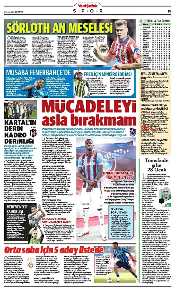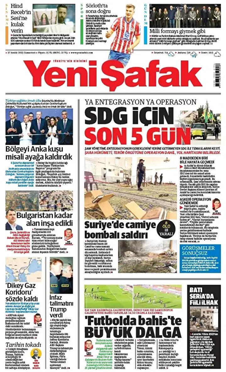 Yeni Şafak Gazetesi’nin 27 Aralık 2025 tarihli birinci sayfasında yer alan manşet ve haberler…