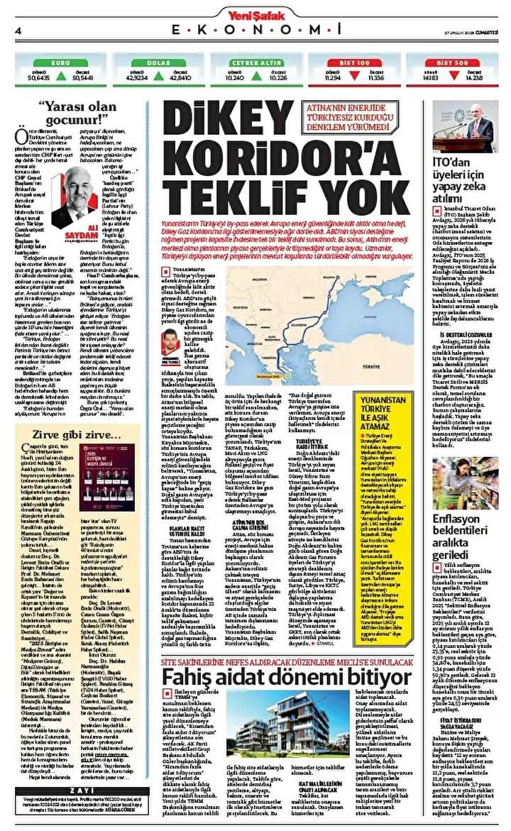 Yeni Şafak Gazetesi’nin 27 Aralık 2025 tarihli birinci sayfasında yer alan manşet ve haberler… Dikey Koridor’a teklif yok Yunanistan’ın Türkiye’yi by-pass ederek Avrupa enerji güvenliğinde kilit aktör olma hedefi, Dikey Gaz Koridoru’na ilgi …