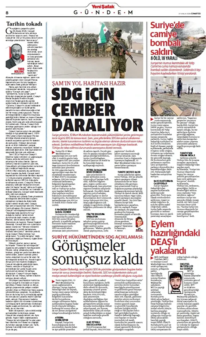 Suriye yönetimi, 10 Mart Mutabakatı kapsamındaki yükümlülükleri yerine getirmeyen terör örgütü SDG ile teması kesti. Şam, yeni yılla birlikte SDG’den petrol sahalarının devrini, devlet kurumlarının teslimini ve örgüte eleman alımının durdurulmasını talep edecek. Şartların reddedilmesi halinde askeri operasyon için düğmeye basılacak. Türkiye de talep edilmesi durumunda operasyona destek verecek.