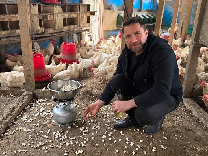 Ağzı açık tencereden etrafa sıçrayan patlamış mısırları yiyen tavukların zamanla streslerinin azaldığını gözlemleyen Tanrıvermiş, “Kış aylarında özellikle yağışlı havalarda tavuklarımı doğaya salamadığım için kümeste strese girmeye başladılar. Yumurta sayılarında da biraz düşüş olduğunu belirledim.