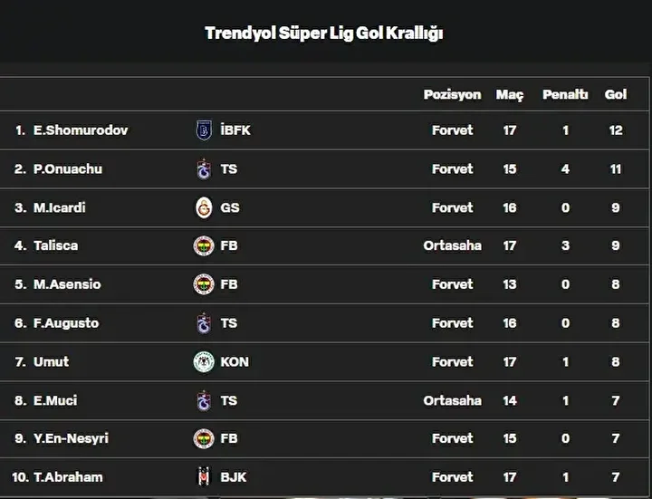 Sezonun ilk bölümünü gol krallığında lider tamamlayan isim, Başakşehir’in Özbek forveti Eldor Shomurodov oldu. Deneyimli oyuncu, rakip fileleri 12 kez havalandırarak listenin başına yerleşti.