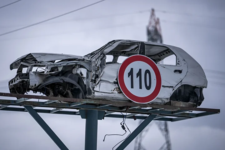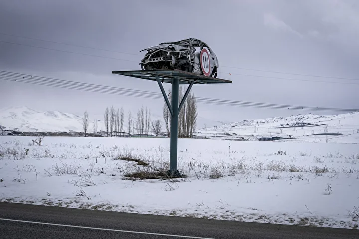 Demir ayaklar üzerinde sergilenen ağır hasarlı araçlar, yoldan geçen sürücülerin dikkatini çekiyor.