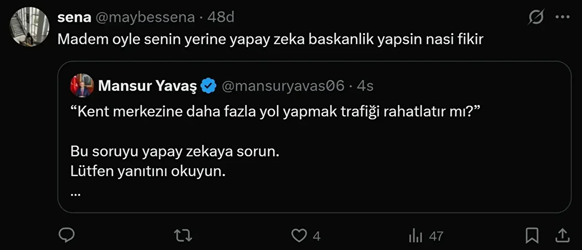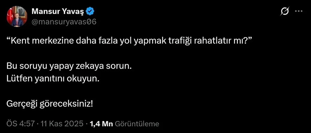 Ankara’daki trafik sorununa çözüm üretemediği için tepkilerin odağı haline gelen Ankara Büyükşehir Belediye Başkanı Mansur Yavaş, kendisini ‘yapay zekâ’ ile savundu. Hemen her fırsatta şehir merkezine yol yapmanın trafiği daha da artıracağını iddia eden Yavaş, “Bu soruyu yapay zekâya sorun, yanıtı okuyun” dese de vatandaş hâlâ tepkili… Somut bir adım göremeyen Ankaralılar, Yavaş’a tepkisini, “O zaman bırakın ChatGPT yönetsin belediyeyi Mansur Bey” ifadeleriyle dile getiriyor.