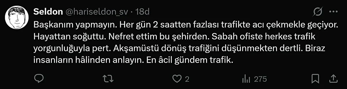 -Başkanım yapmayın. Her gün 2 saatten fazlası trafikte acı çekmekle geçiyor. Hayattan soğuttu. Nefret ettim bu şehirden. Sabah ofiste herkes trafik yorgunluğuyla pert. Akşamüstü dönüş trafiğini düşünmekten dertli. Biraz insanların hâlinden anlayın. En âcil gündem trafik.