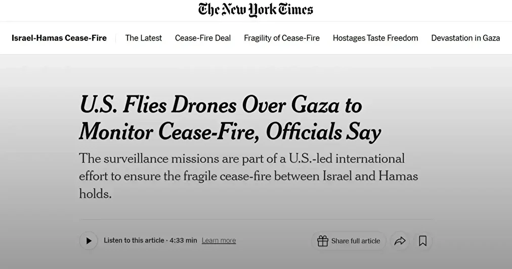 NYT’deki “Yetkililer, ABD’nin ateşkesin izlenmesi için Gazze üzerinde insansız hava araçları uçurduğunu açıkladı” başlıklı haber.