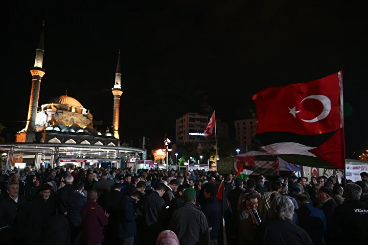 Uşak’ta toplanan çok sayıda kişi, ablukayı kırmak ve insani yardım ulaştırmak amacıyla Gazze’ye doğru yol alan Küresel Sumud Filosu’na İsrail tarafından yapılan saldırılara tepki gösterdi.
