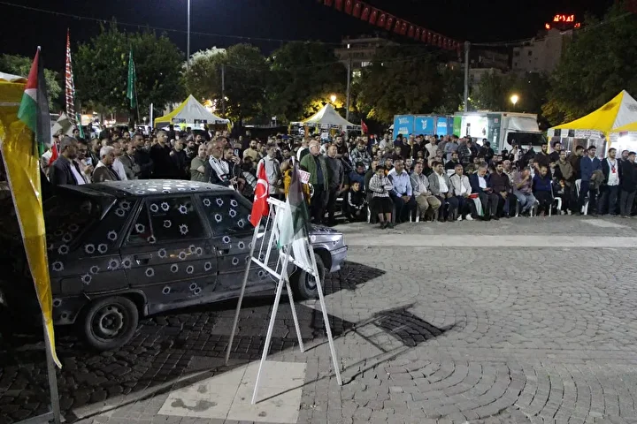 Gaziantep’te demokrasi meydanında toplanan vatandaşlar, İsrail’in Küresel Sumud Filosu’na yönelik saldırısını protesto etti.