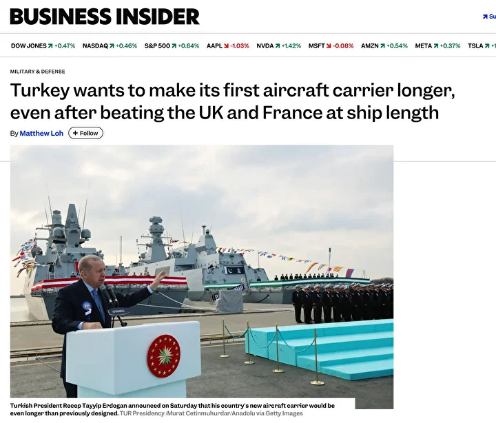 Cumhurbaşkanı Recep Tayyip Erdoğan’ın, yapımı süren uçak gemisinin 300 metre uzunluğa çıkarılacağını açıklamasını hatırlatan Business Insider, bu adımın Türkiye’yi İngiltere ve Fransa’nın önüne geçirdiğini yazdı.