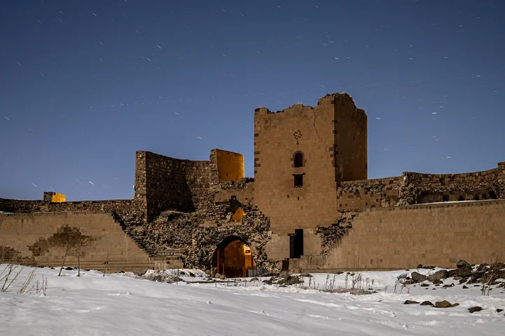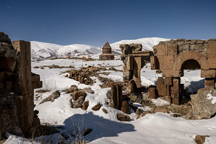 UNESCO Dünya Miras Listesi’nde yer alan Kars’taki Ani Ören Yeri, son günlerde etkili olan kar yağışıyla beyaza büründü. Karla kaplanan Ani’deki Ebul Menucehr Camisi, yıldız pozlama tekniğiyle görüntülendi.