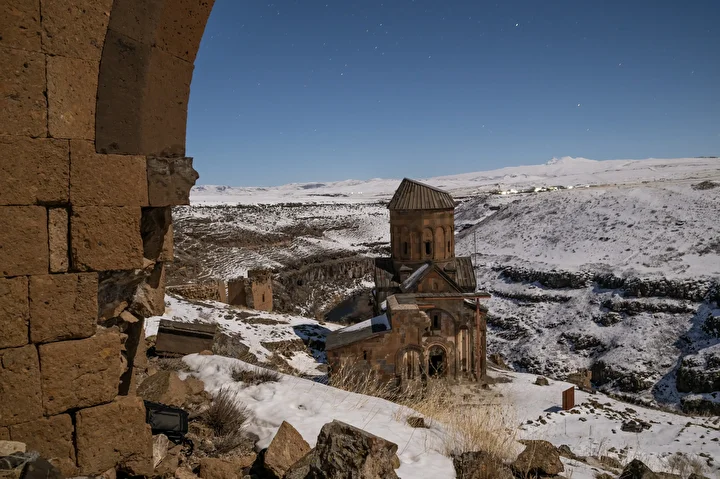 Karla kaplanan Ani’deki Ebul Menucehr Camisi, yıldız pozlama tekniğiyle görüntülendi.