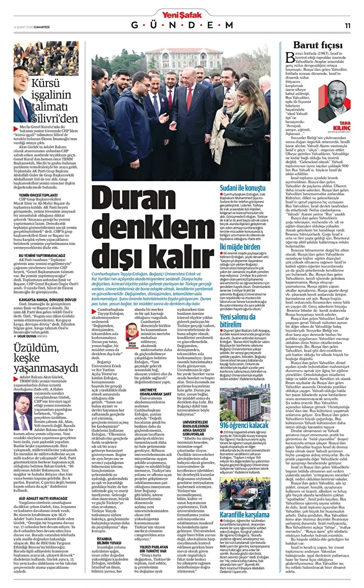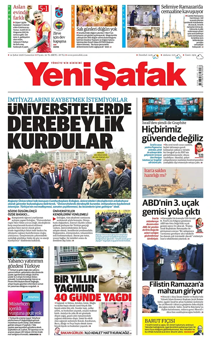 Yeni Şafak Gazetesi’nin 14 Şubat 2026 tarihli birinci sayfasında yer alan manşet ve haberler…