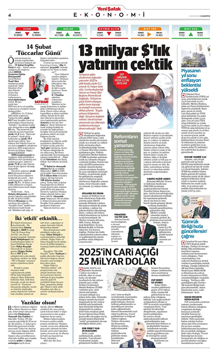 Yeni Şafak Gazetesi’nin 14 Şubat 2026 tarihli birinci sayfasında yer alan manşet ve haberler… 13 milyar dolarlık yatırım çektik Türkiye’ye gelen uluslararası doğrudan yatırımlar 2025’te yıllık bazda yüzde 12,2 artarak 13,1 milyar dolar oldu …