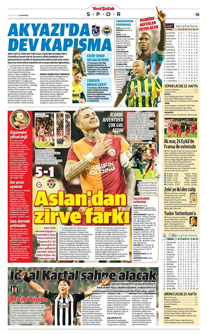 Süper Lig’de sahasında Eyüpspor’u konuk eden G.Saray; Yunus, İcardi (3) ve Onguene (k.k.) ile sonuca gitti. Üst üste 4. galibiyetini alan Aslan, takipçisi F.Bahçe ile farkı, maç fazlasıyla 6 yaptı.