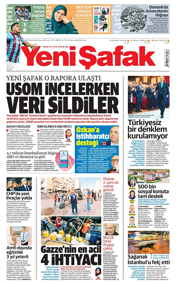 Yeni Şafak Gazetesi’nin 26 Ekim 2025 tarihli birinci sayfasında yer alan manşet ve haberler…