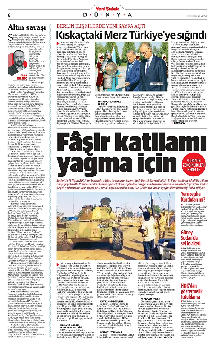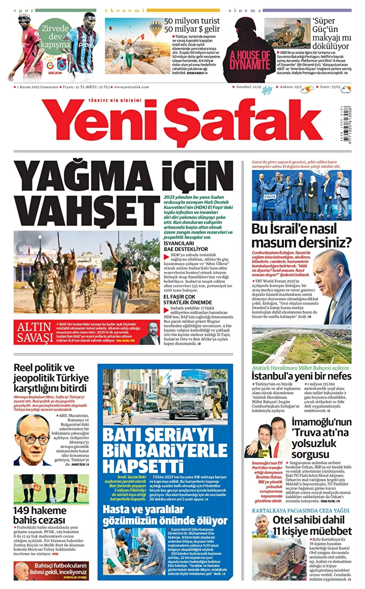 Yeni Şafak Gazetesi’nin 01 Kasım 2025 tarihli birinci sayfasında yer alan manşet ve haberler…