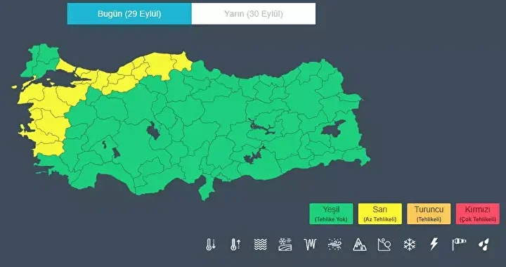 Meteoroloji Genel Müdürlüğü tarafından yapılan son tahminlere göre; yağışların, Marmara’nın doğusu, Batı ve Orta Karadeniz, Aydın, Uşak, Afyonkarahisar, Kırıkkale, Nevşehir ve Yozgat çevreleri ile Çanakkale’nin doğu, İzmir ve Ankara’nın güney kesimlerinde yer yer kuvvetli olması bekleniyor.