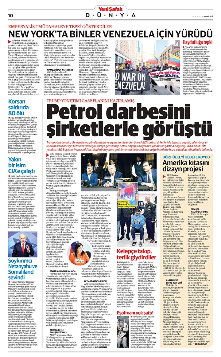 Yeni Şafak Gazetesi’nin 05 Ocak 2026 tarihli birinci sayfasında yer alan manşet ve haberler… Çin’i Latin Amerika’dan çıkarma hamlesi Venezuela dünya petrol rezervinin %17’sine sahip. Ülke ayrıca altın ve lityum zengini. Enerji dönüşümünün kilit …